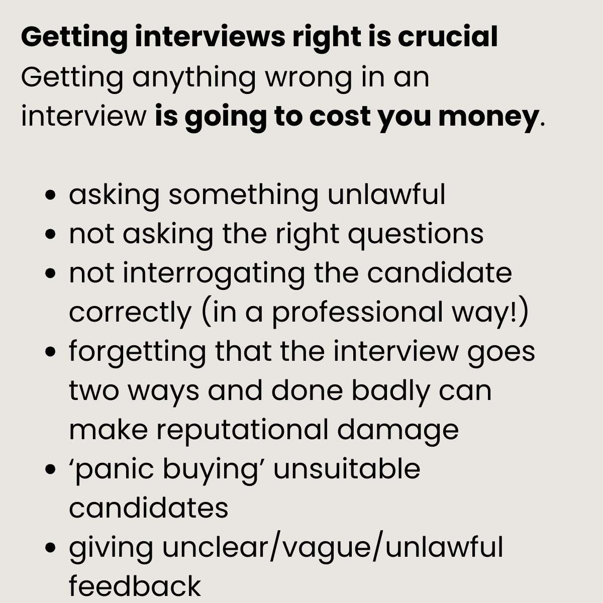 We pride ourselves on providing amazing candidates but poorly run interviews can expose your business to legal risk, wasted time, and costly hiring mistakes.